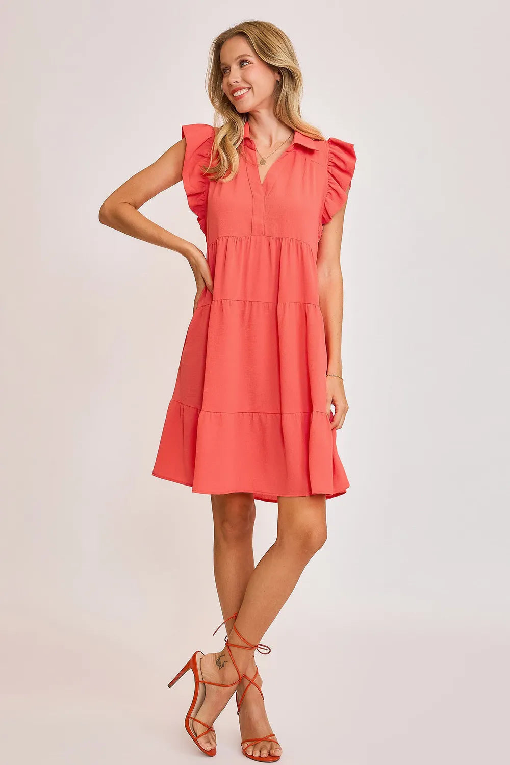 A Johnny collar ruffle cap sleeve tiered dress combines elegance and charm. The Johnny collar adds a sophisticated touch, while the ruffle cap sleeves offer a delicate and feminine detail. The tiered design creates a flowy and dynamic silhouette, flattering for many body types. Overall, this dress is a beautiful choice for various occasions, blending classic and modern elements for a fashionable and chic look.